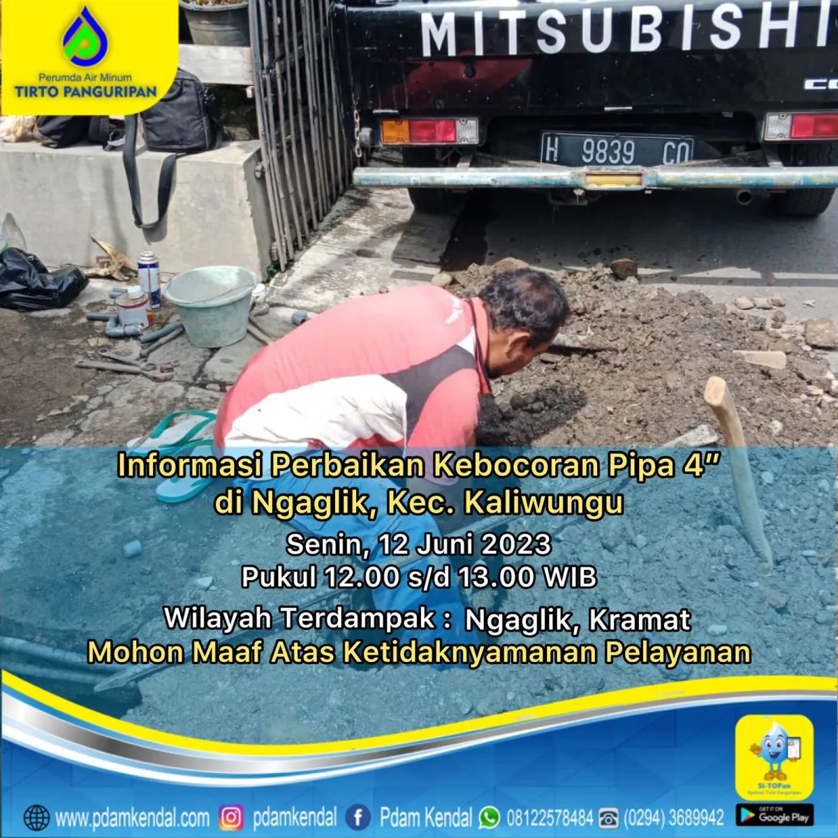 Informasi perbaikan kebocoran pipa 4" di Ngaglik, Kec. Kaliwungu. Senin, 12 Juni 2023, pukul 12.00 s/d 13.00 WIB. Hal tersebut akan menyebabkan aliran terganggu