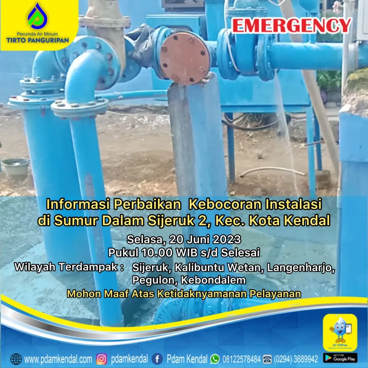 Informasi perbaikan kebocoran instalasi di Sumur Dalam Sijeruk 2, Kec. Kota Kendal. Selasa, 20 Juni 2023, pukul 10.00 WIB s/d selesai. Hal tersebut akan menyebabkan aliran terganggu