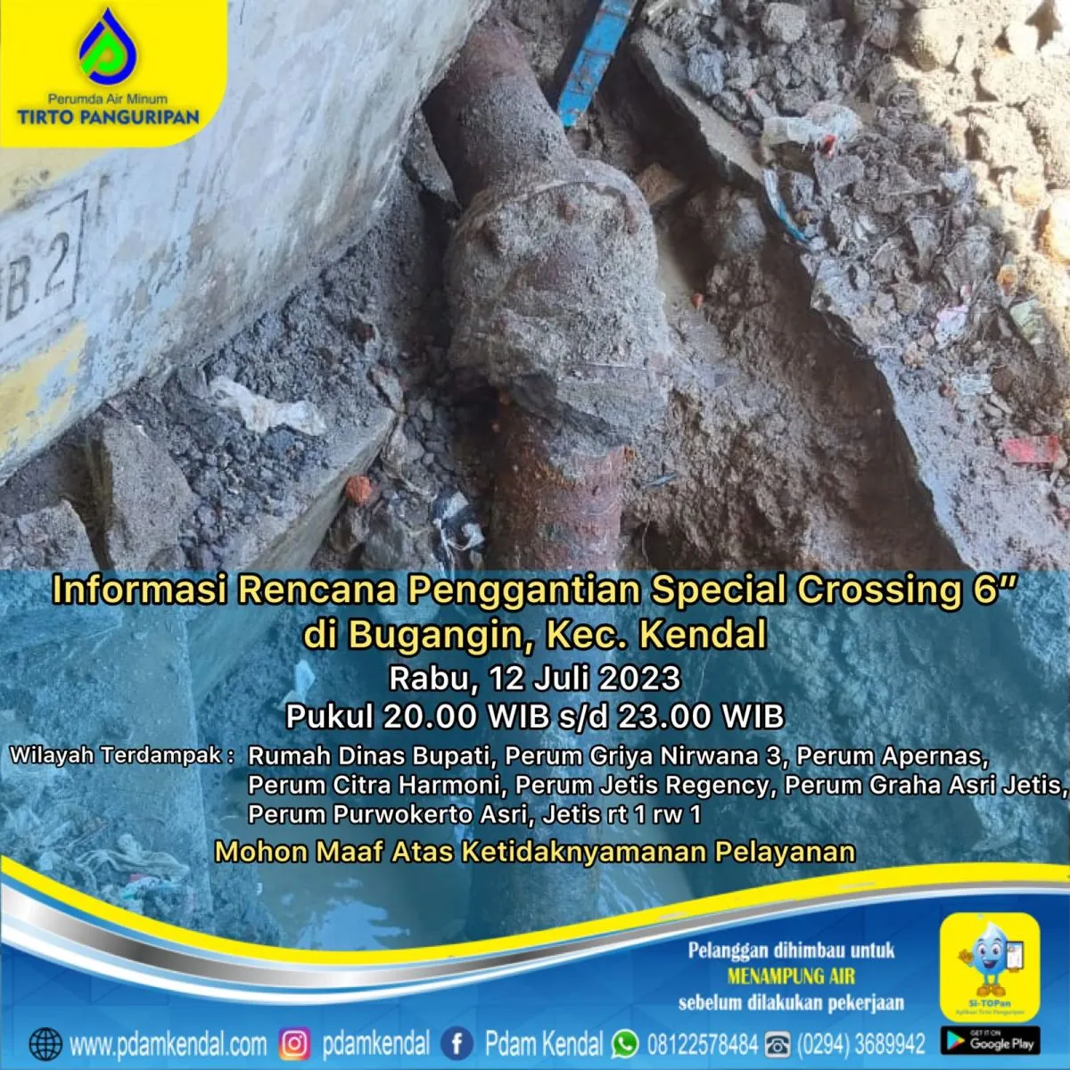 Informasi rencana penggantian Special Crossing 6" di Bugangin, Kec. Kendal. Rabu, 12 Juli 2023, pukul 20.00 s/d 23.00 WIB. Hal tersebut akan menyebabkan aliran terganggu
