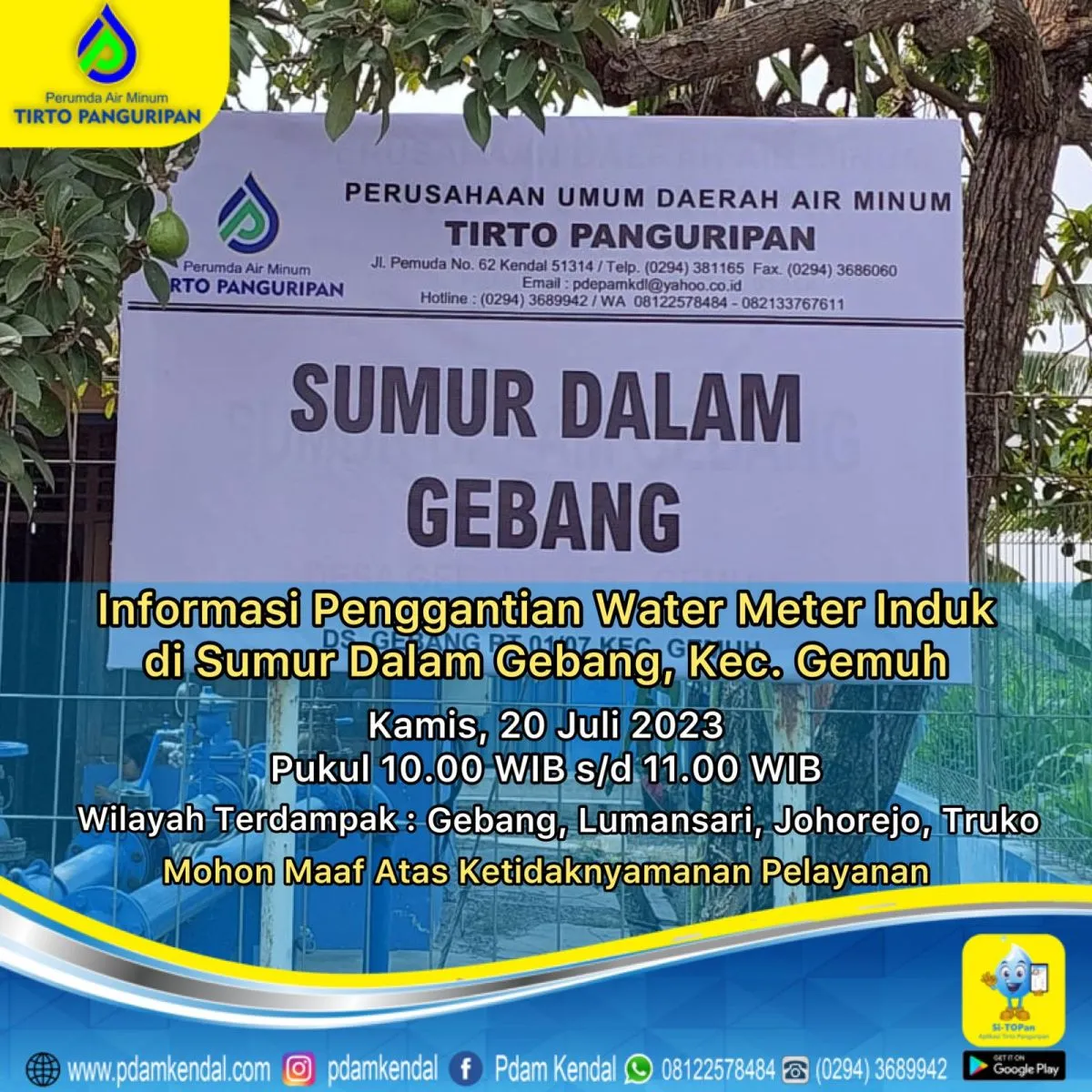 Informasi penggantian Water Meter Induk di Sumur Dalam Gebang, Kec. Gemuh. Kamis, 20 Juli 2023, pukul 10.00 - 11.00 WIB. Hal tersebut akan menyebabkan aliran terganggu